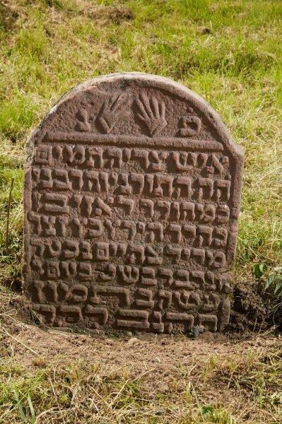 Rechteckige Stele mit angedeutetem Karniesbogenabschluss, das vertiefte Schriftfeld durch schmale horizontale Rahmenleiste unter der ersten Zeile zweigeteilt. Schrift erhaben. Zwischen dem פ und dem נ der Einleitungsformel segnende Hände.