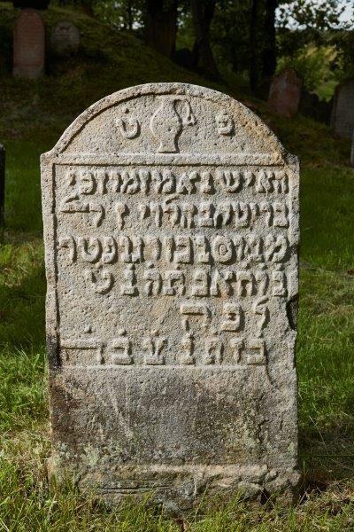 Hochrechteckige Stele mit leicht eingezogenem Flachbogen als oberem Abschluss, das vertiefte Schriftfeld durch horizontale Rahmenleiste unter dem Bogen zweigeteilt. Schrift erhaben. Zwischen den beiden Buchstaben der Einleitungsformel eine Levitenkanne im Relief.
