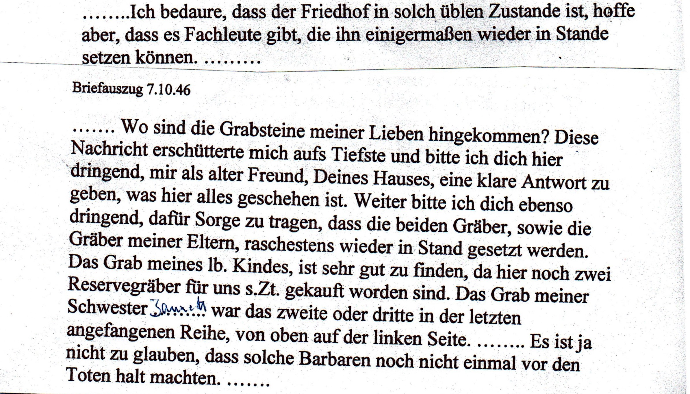 Angefügt ist der Ausschnitt aus einem Brief vom 7. Oktober 1946 an einen guten Ingenheimer Freund, indem Max Marx drum bittet, die geschändetetn Gräber wieder herzurichten.