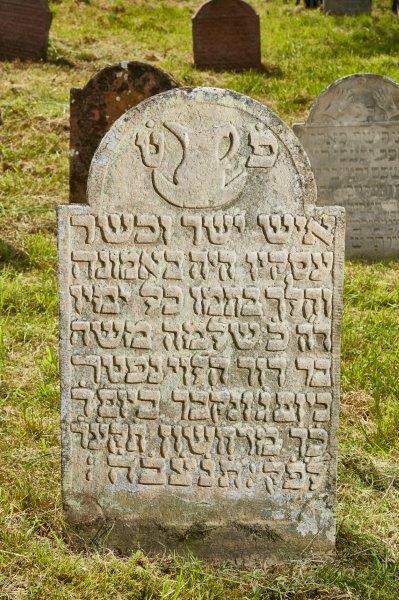 Hochrechteckige Stele mit eingezogenem Hufeisenbogen, schmaler umlaufender Rahmen mit Scharrierung. Schrift erhaben. Zwischen den beiden Buchstaben der Einleitungsformel große Levitenkanne mit Schüssel im Relief.