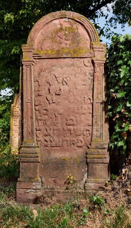 Die hochrechteckige Stele schließt mit einem leicht eingezogenen Rundbogen mit vierfach getrepptem Rahmen, die Schultern sind als mehrfach gegliederte Pilasterkapitelle ausgeführt. Das schmaler werdende Schriftfeld gerahmt von Pilastern auf mehrfach gegliederten Basen. Schrift erhaben.