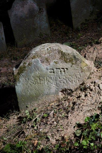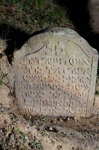 Rückseite: Die erste Zeile grob eingehauen, die zweite Zeile mit eingeritzten Buchstabenumrissen. Zum Synagogennamen Jaakow gehört häufig der Alltagsname Jokew.
