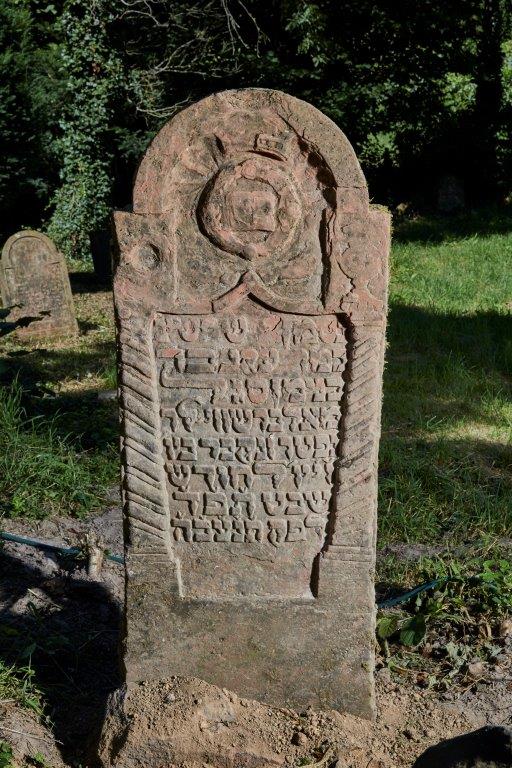 Im leicht eingezogenen Rundbogen mittig eine Krone, darunter ein Kranz mit der ersten Zeile פה im Stil eines aufgeschlagenen Buches. Rechts und links unter den „Schultern“ Levitenkanne und Schüssel. Seitlicher, pilasterförmiger Rahmen mit Taubandmuster versehen. Schrift erhaben.