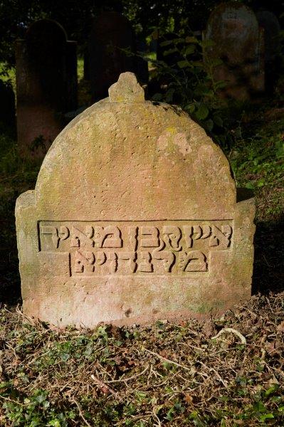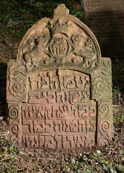 Reich verzierte Stele, oberer Abschluss als eingezogener Rundbogen mit Akroterion (beschädigt). Im Halbrund zwei Löwen, die ein Herz halten, darin das פה, darüber eine Krone, alles im Hochrelief. Beidseits Kapitelle mit je einer großen Rosette und Pilaster mit Rankenband aus Voluten als seitlicher Rahmen. Von den Rosetten ausgehende, sich zur Perlenschnur wandelnde Ranke als Begrenzung zum oberen Schriftfeld im Halbrund. Schrift erhaben, ebenfalls auf der Rückseite, dort in vertieftem, einfachen Rahmen.