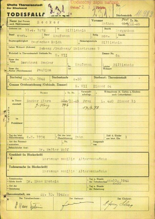 Nathan Becker, Sohn der Eheleute Bernhard Becker und Paulina Weiß, heiratete am 04. März 1904 in Dahn Klara Katz. Gemeinsam wohnten sie in BIlligheim und später in Bamberg, Heinstr. 7. Nathan wurde vom 15. - 28. November 1938 im KZ Dachau interniert. Von Nürnberg aus wurde er gemeinsam mit seiner Frau Klara am 10. September 1942 ins Ghetto Theresienstadt deportiert. Nathan mit dem Transport II / 25 Nr. 605. Seine Wohnadresse in Theresienstadt lautete: E VII Zimmer 64.