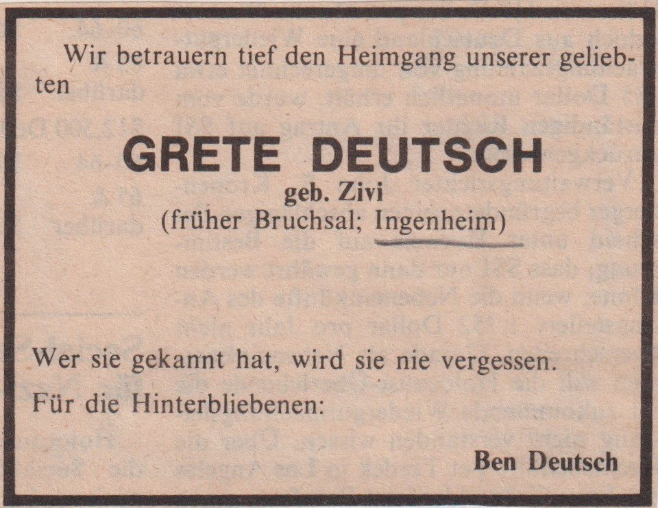 Margareta Deutsch übersiedelte am 13. Januar 1939 zusammen mit ihrer Familie nach New York.