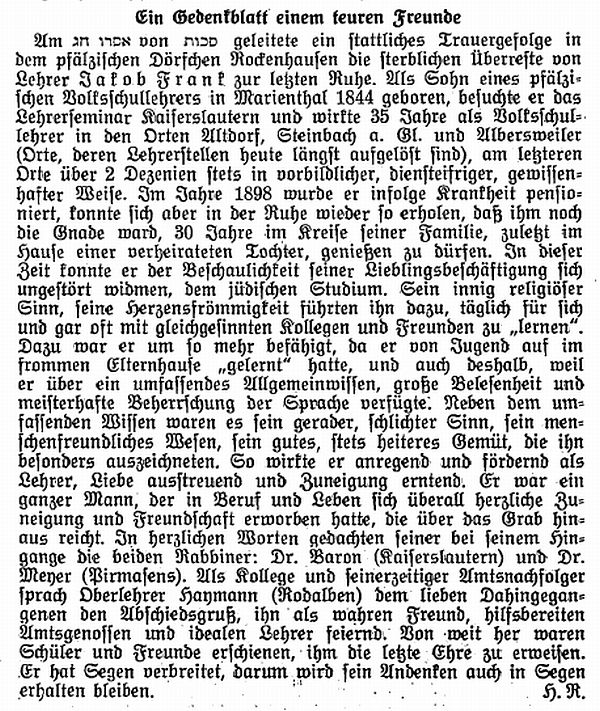 Der Schullehrer Jakob Frank war der Sohn von Volksschullehrer Joseph Frank und Martha Eichner. Er war verheiratet mit Mathilde Frank. Jakob starb im Alter von 84 Jahren und wurde auf dem jüdischen Friedhof in Rockenhausen beerdigt.