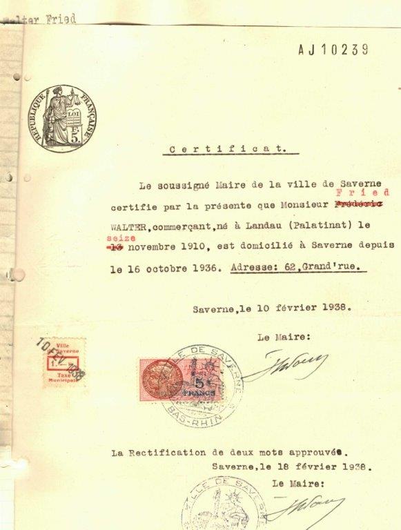 Das Konsulat in Mainz hatte ihm einen bis zum 23. Mai 1937 gültigen französischen Pass ausgestellt. Dies war ohne Probleme möglich, da seine Großmutter mütterlicherseits, Rosalie Loeb, die am 27. April 1859 in Monneren (Lothringen) geboren und zuletzt als Witwe von Josef Loeb in Wiesbaden wohnhaft, somit altelsässischer Herkunft war. Walter war 1936 dann auch in Monneren registriert. Am 10. Februar 1938 bestätigt der Maire von Saverne, dass Walter seit dem 16. Oktober 1936 in Saverne, 62 Grand Rue wohnhaft ist.