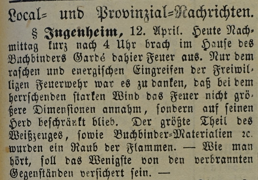 Der Buchbinder Israel Garde, genannt Isidor, Sohn der Eheleute Salomon Garde und Betty Hammel aus Friedberg.Im Alter von 30 Jahren zeugte er - ledig - mit der verwitweten Sibilla Deutsch die Tochter Babetta, dioe in Klingen zur Welt kam. Nachdem Sibilla 1863 verstorben war, heiratete er am 03. Januar 1865 in Klingen die Spezereiwarenhändlerin Sara Felsenthal. IGemeinsam hatte das Ehepaar drei Kinder. Israel / Isidor starb in Ingenheim im Alter von 66 Jahren und wurde auf dem jüdischen Friedhof in Ingenheim beerdit. Grabnummer: 3 02 07.