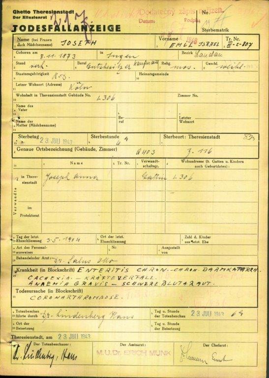 Wohnungen: Am 01. Mai 1897 kam Emil von Amerika, wo er wohl vergeblich sein Glück versucht hatte, nach Landau zurück. - Am 13. Mai 1904 wohnte er Ostring 12. Ab 29. August 1919 ist er auf Reisen. Am 01. Oktober 1919 wohnt er wieder Ostring 12. Am 09. Dezember 1938 ist er in Köln gemeldet. Laut Schreiben vom 3. Juni 1941 ist die derzeitige Wohnung des Joseph Emil in Köln, Venloerstraße 23 bei Mayer Ettlinger. Ab Trier-Köln den 27. Februar 1942 Abfahrt/Ankunft in Theresienstadt. Tod: 23. Juli 1943 in Theresienstadt.