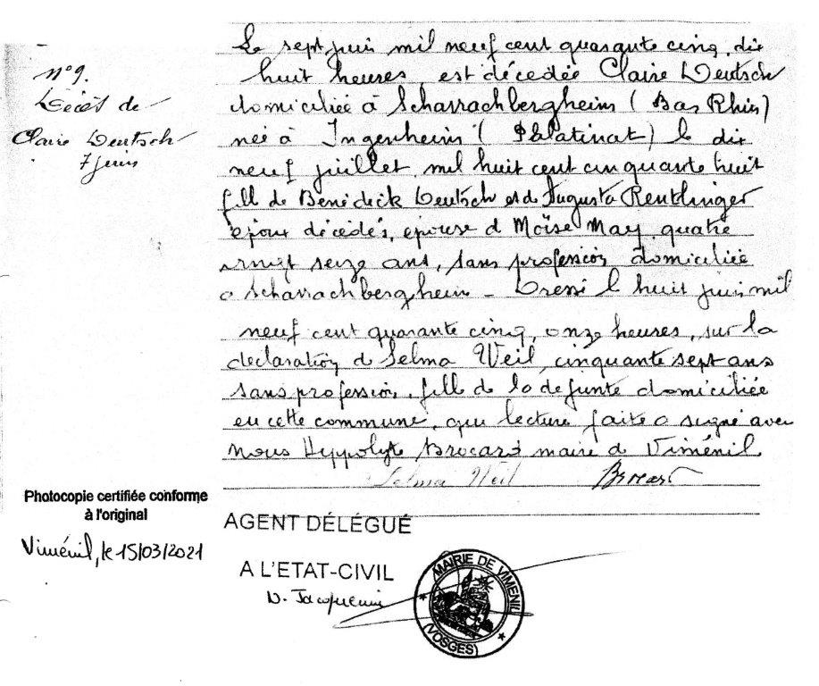 Clara war die Tochter von Benedikt Deutsch und Auguste geb. Reitlinger. Sie heiratete am 19. April 1882 in Scharrachbergheim den Metzger Moses May. Clara starb im Alter von 86 Jahren in Viménil / Vosges.