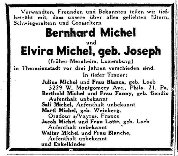 Bernhard Michel, Sohn von Markus Michel und Helena Borg aus Merxheim, heiratete 1893 in Merxheim Elvira Joseph aus Ingenheim. Gemeinsan hatten sie sechs Kinder, von denen ein Sohn an den Folgen des 1. Weltkriegs verstarb, ein Sohn auswandern konnte, aber 4 Söhne und deren Ehegatten in verschiedenen Vernichtungslagern ermordet wurden.