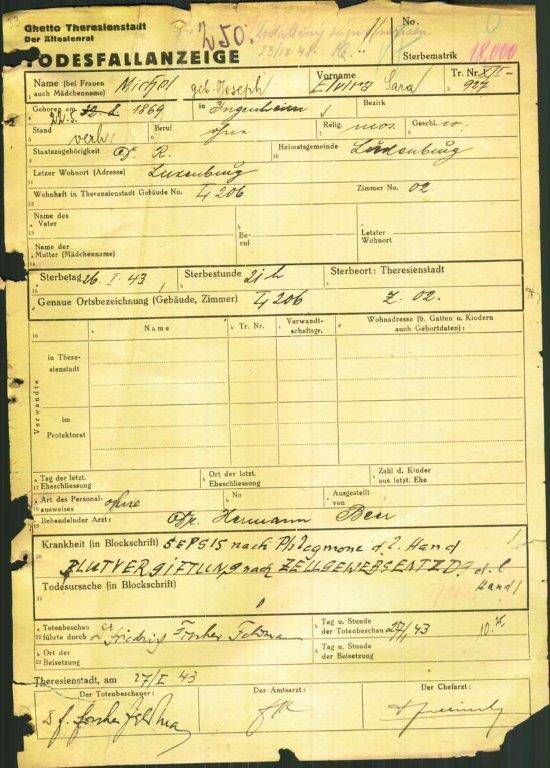 Wohnungen: Merxheim und Andernach (Laut Yad Vashem) und Hollicherstraße 66 (Ort nicht angeführt ist wahrscheinlich Steinfurt). 20. Septeber 1938 Ankunft in Luxemburg – Melderegister der Stadt Luxemburg unter der Nummer: 57918 eingetragen (die beiden Eheleute). 25. August 1941 (gemeinsam?) deportiert ins Kloster Cinqfontaines (diente damals als Konzentrationslager für die in Luxemburg wohnenden Juden). Eingeliefert in Theresienstadt am 30./ 29. (Gedenkbuch) Juli 1942 durch Gestapo Dortmund, Transport Nr. X/1-927 – Dort ist sie am 26. Januar 1943 verstorben. Der Todesnachweis aus Theresienstadt liegt vor. Andere: Am 19. April 1945 in Bergen-Belsen verstorben.