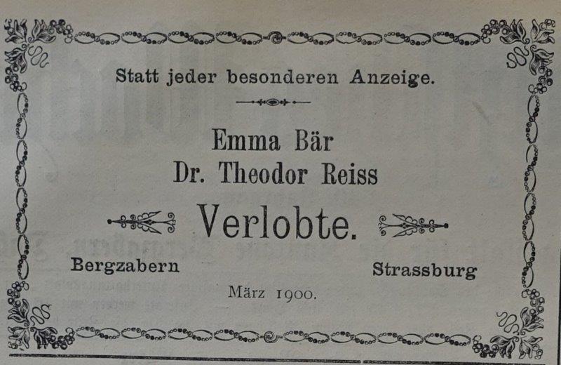 Emma war die Tochter des Güterhändlers Bernhard genannt Berthold Bär und Clara Levi. Sie heiratete am 14. Mai 1900 in Straßburg den Doktor der Jurisprudenz und Bankdirektor Theodor Reiß aus Rödersheim.