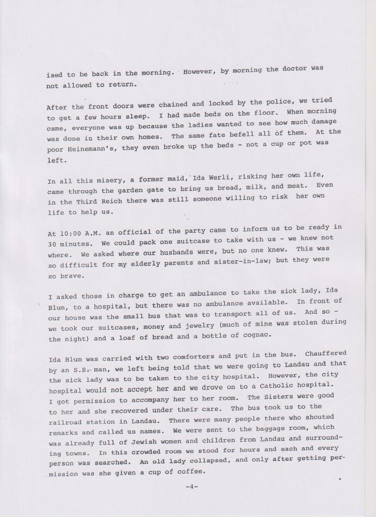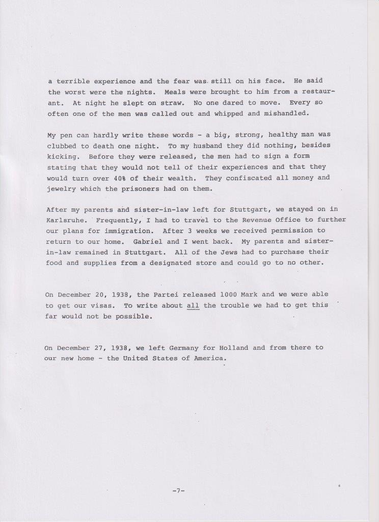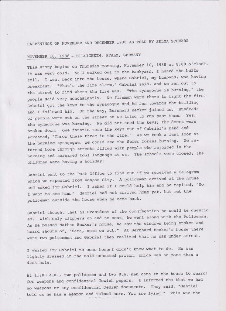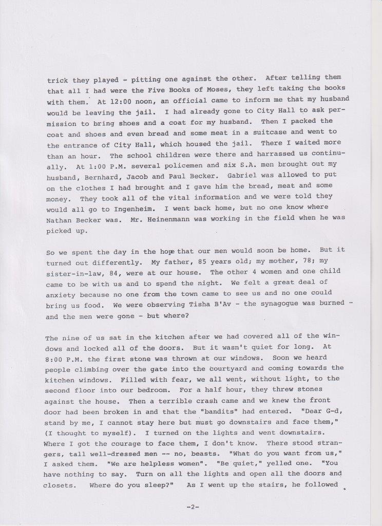 Das änderte sich schlagartig nach der Pogromnacht. Immer wieder wurde die Familie überfallen. Gabriel wurde acht Tage lang inhaftiert und kehrte als gebrochener Mann aus der Haft nach Billigheim zurück. Trotz der vielen Verbote und Behinderungen durch die Nazis gab es im Ort gute Nachbarn, die der Familie in diesen schweren Zeiten beigestanden sind und ihnen geholfen haben.