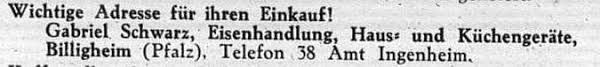 Gabriel II. Schwarz, Sohn der Eheleute Jesajas Schwarz und Carolina Becker, war verheiratet mit Selma / Selin Alexander aus Landau / Waldeck. Gabriel, "dä Eise-Jud" wie er im Dorf genannt wurde, führte zuerst in der Firststraße 265, später dann in der Bahnhofstraße 227 bis 1938 einen Haus- und Geräte- und Eisenwarenhandel. Gabriel und seine Familie waren im Ort Billigheim geschätzte Personen. In der Synagoge und im Gemeinderat hörte man auf Gabriels Stimme.