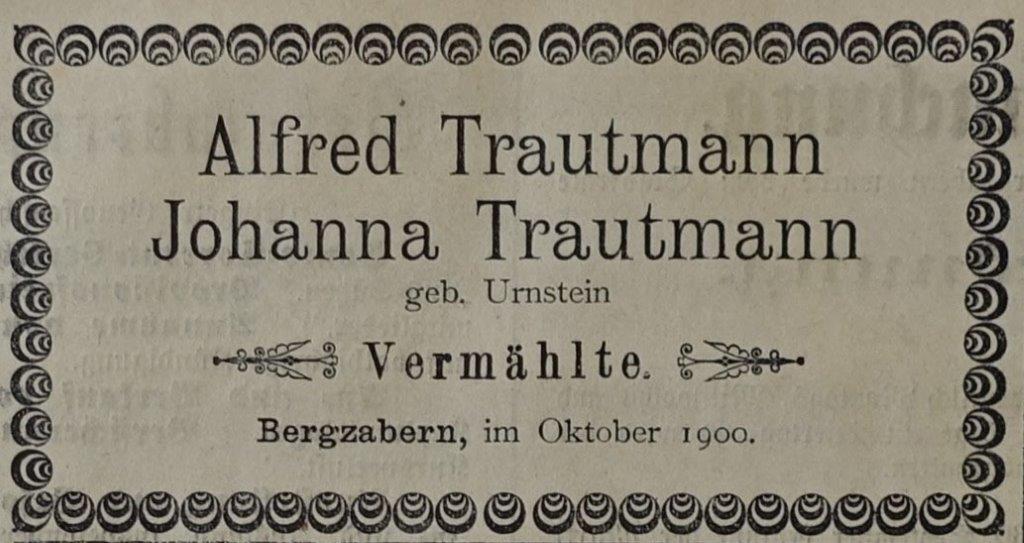 Simon Alfred Trautmann, Sohn von Simon, genannt Bernhard Trautmann und Hindel Maier, heiratete am 24. Oktober 1900 in Mannheim die aus Mainz stammende Eva Johanna Urnstein.. Das Paar wohnte in München. Von hier aus wurden die beiden am 10. Juni 1942 nach Theresienstadt deportiert und am 19. September 1942 weiter nach Treblinka, wo sie ermordet wurden.