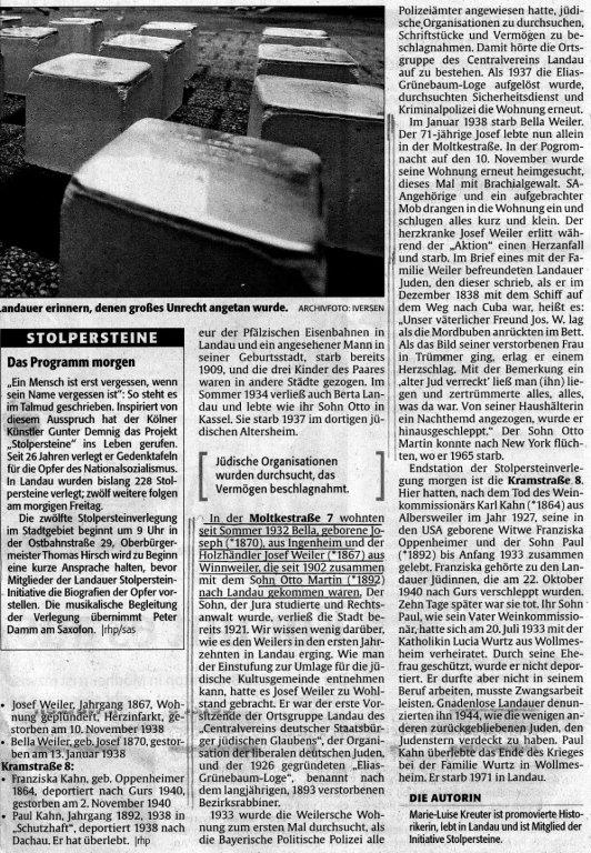 Bella / Isabella Joseph, Tochter der Eheleute Joseph Joseph und Sara ge. Marx, heiratete Joseph Weiler. Mit ihm zog sie nach Winnweiler, wo auch Sohn Otto Martin zur Welt kam. 1902 zog sie von Winnweiler nach Landau. Seit dem 01. Juli 1932 wohnte sie in Molktestr. 7. Ihr Grab befindet sich auf dem jüdischen Teil des Landauer Hauptfriedhos Grabnummer: V / 7 / 5.